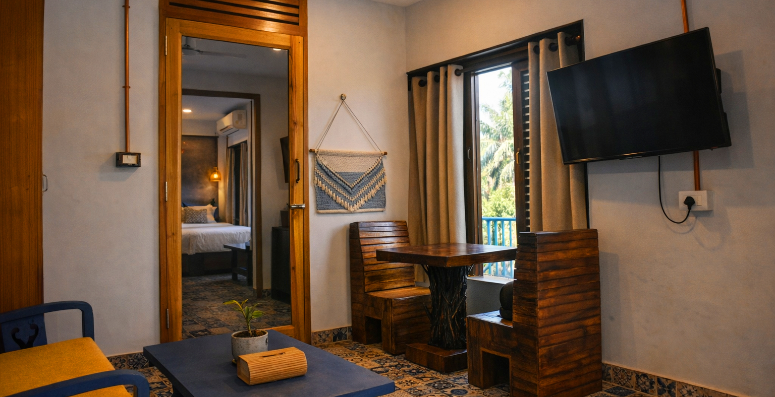 At Ekam Agonda, our intimate two-storey retreat features nine uniquely designed rooms and suites in South Goa, offering a refined boutique hotel stay near Agonda Beach. Each room blends contemporary comfort with coastal elegance, featuring open-air showers, outdoor bathtubs, private patios, balconies, and select sea-view accommodations.