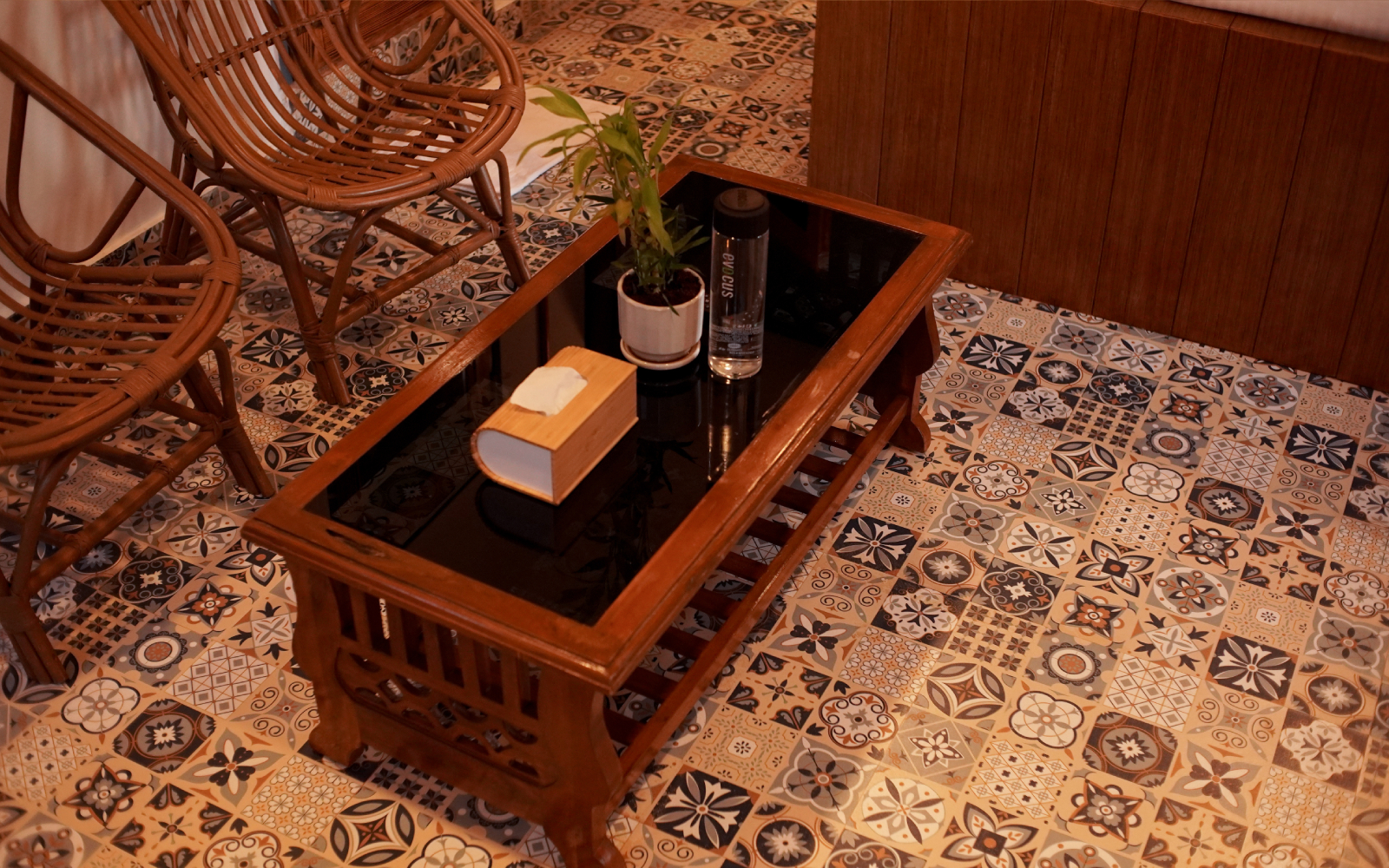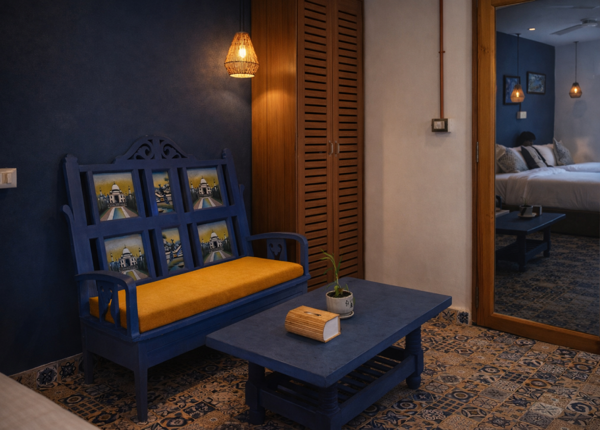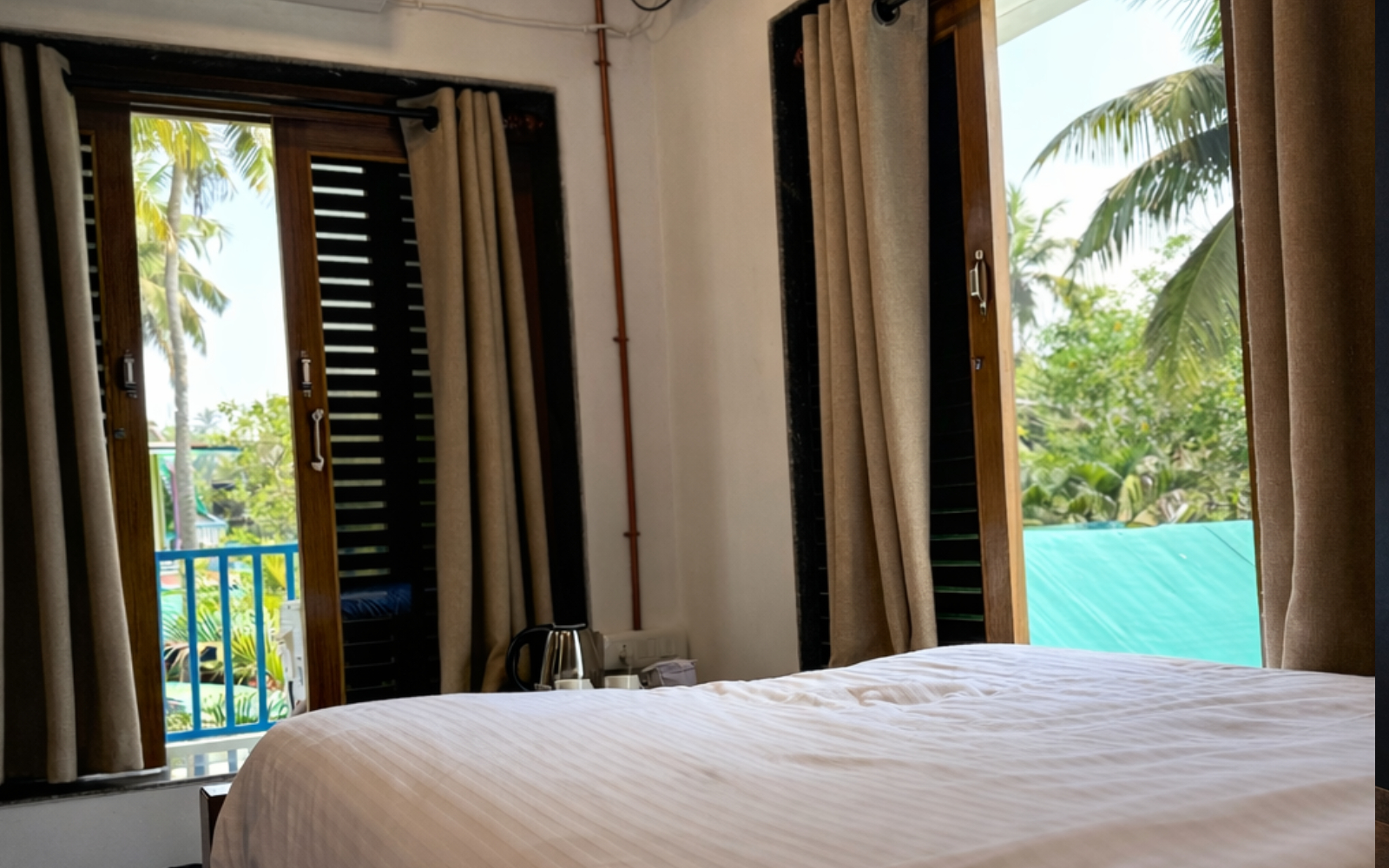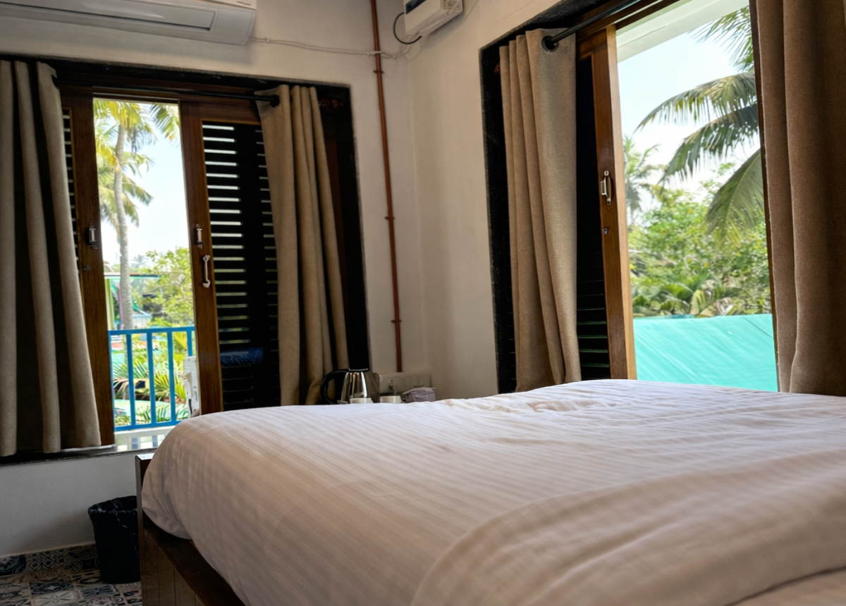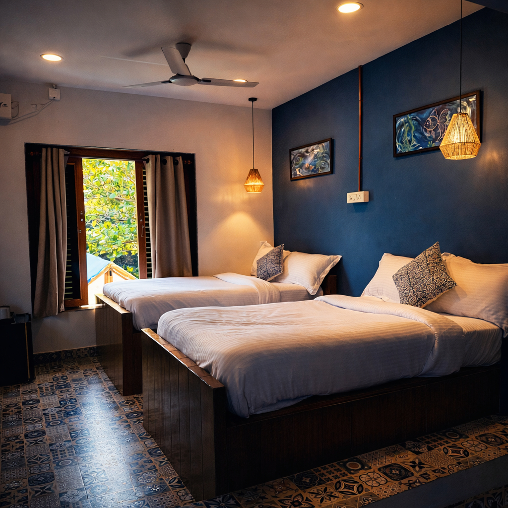 The Spacious Haven. Our largest suite, located on the first floor, is thoughtfully designed for families or groups who desire extra room and privacy. It features two comfortable queen beds, a large bathroom with a relaxing indoor bathtub, and a separate lounge area with a cozy couch. Guests enjoy the exclusive benefit of a dedicated private chill-out patio, adding an intimate, secluded space to your boutique stay. The Family Suite combines generous space with exclusive amenities, making it the perfect setting for a memorable Goan holiday.