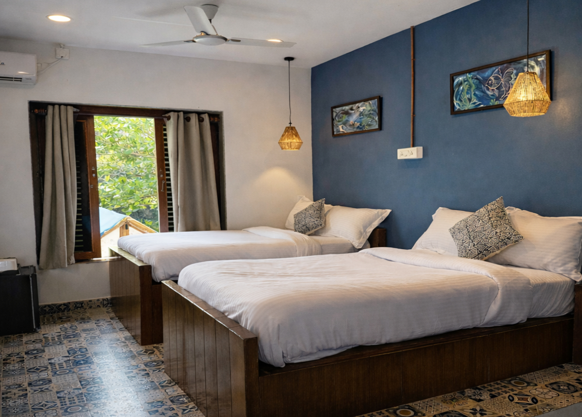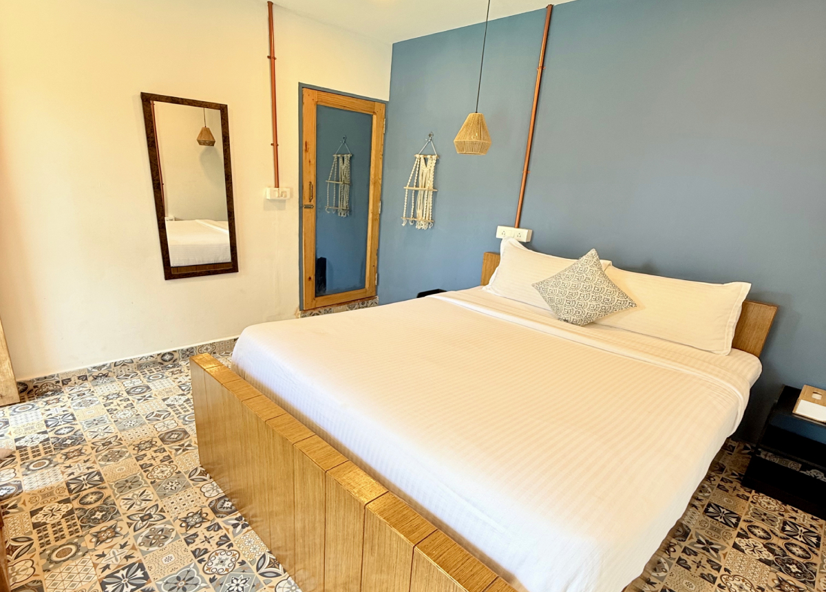 Designed for travelers seeking a peaceful stay in Agonda, our interiors combine natural textures, Santorini-inspired white-and-blue tones, and calming aesthetics that reflect the spirit of slow living in Goa. Whether you’re planning a romantic getaway, a wellness retreat, or a serene beach holiday in South Goa, Ekam offers a thoughtfully curated boutique experience just steps from the sea.
